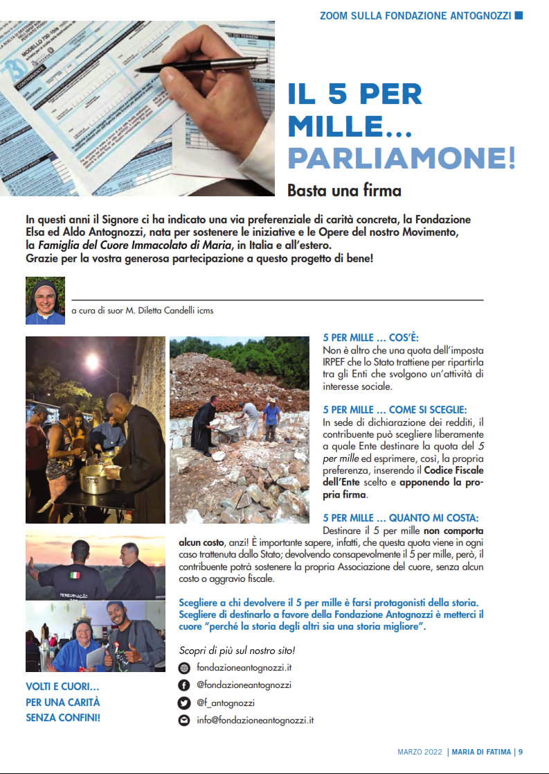 In questi anni il Signore ci ha indicato una via preferenziale di carità concreta, la Fondazione Elsa ed Aldo Antognozzi, nata per sostenere le iniziative e le Opere del nostro Movimento, la Famiglia del Cuore Immacolato di Maria, in Italia e all’estero. Grazie per la vostra generosa partecipazione a questo progetto di bene!