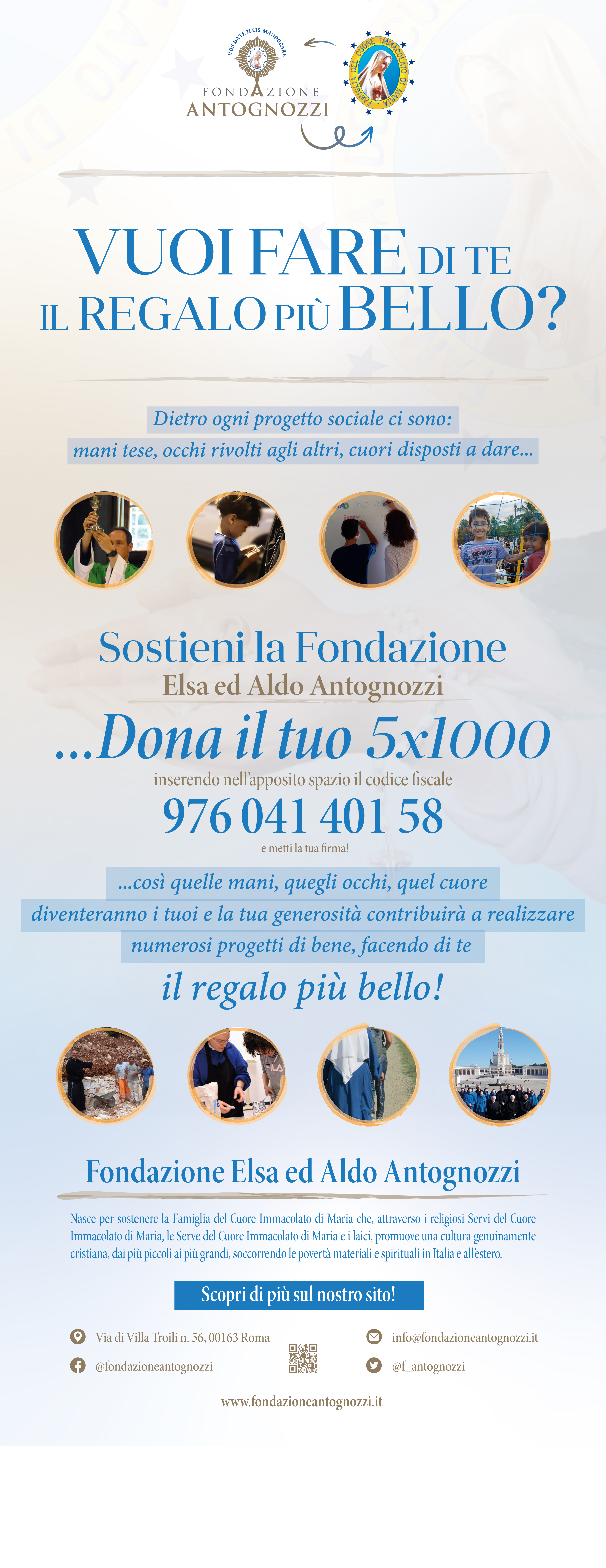 Dona il tuo 5x1000 alla Fondazione Antognozzi onlus: con la tua generosità puoi sostenere tante attività di bene organizzate presso le Opere della Famiglia del Cuore Immacolato di Maria, tramite i progetti sociali finanziati dalla Fondazione.