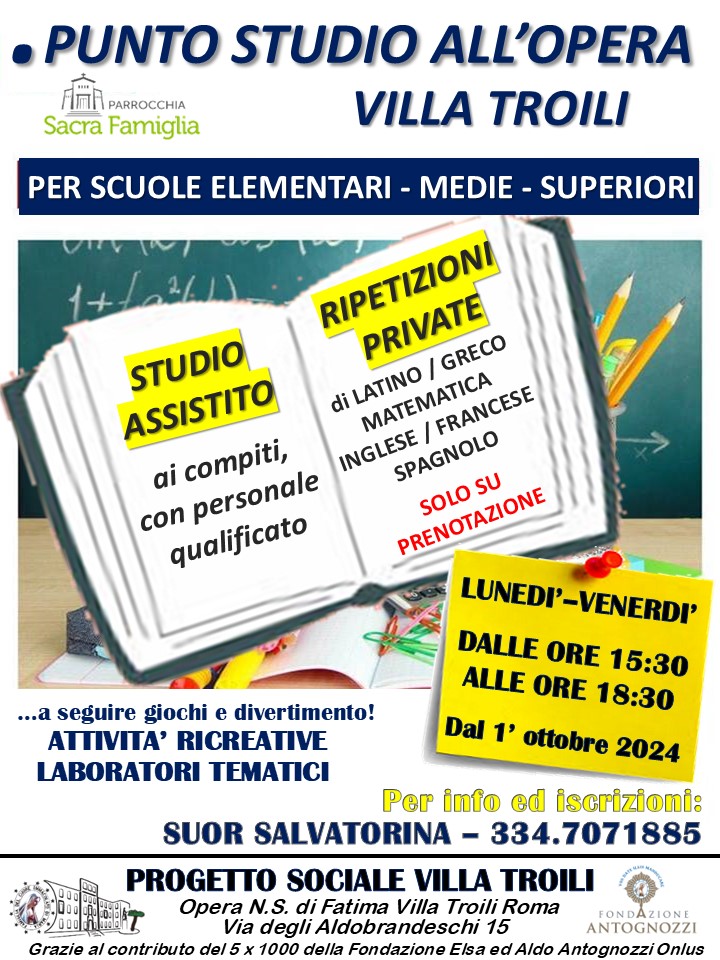 “Punto Studio all’Opera” è un servizio gratuito di studio assistito e ripetizioni per ragazzi/e delle scuole elementari, medie e superiori, di utilità sociale per le famiglie del territorio e, al tempo stesso, strumento per avvicinarle alla realtà della Famiglia del Cuore Immacolato di Maria.