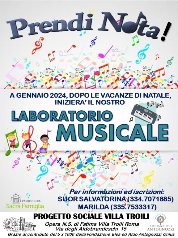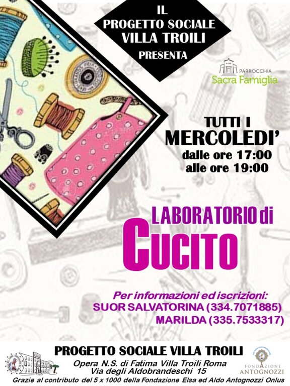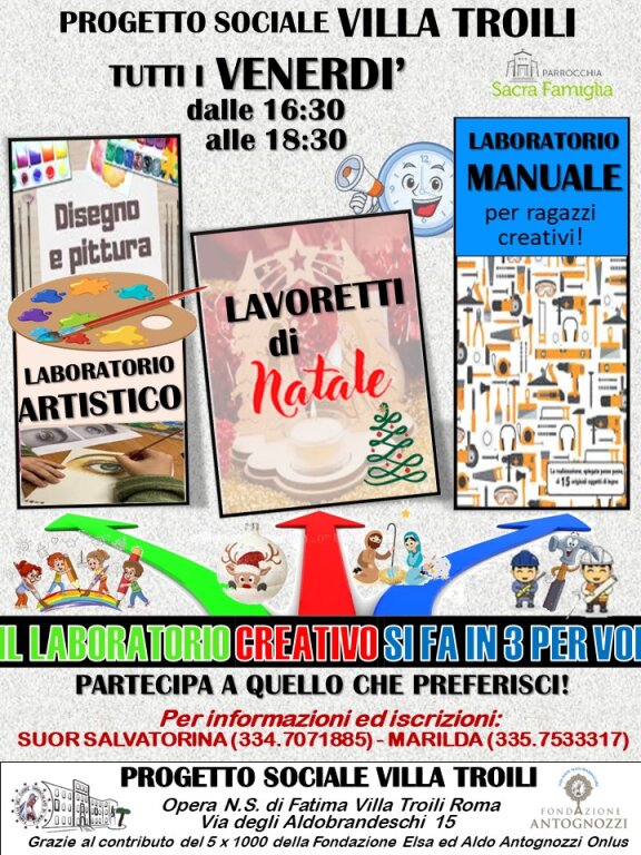 La Fondazione Antognozzi ha realizzato e continua a sostenere un’iniziativa di carattere educativo, formativo e culturale, dell’Opera N.S. di Fatima a Villa Troili (Roma), realizzando così un servizio di utilità sociale per le famiglie del territorio.